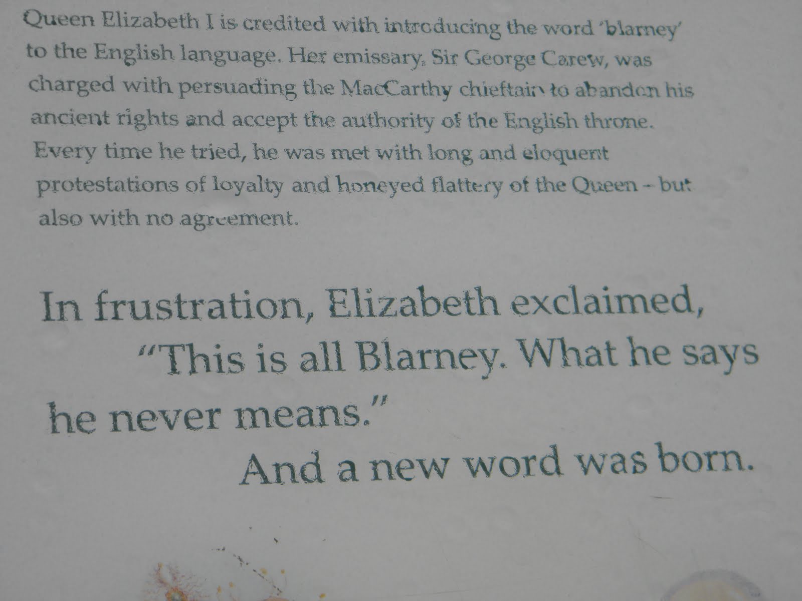 After that, they were pretty much left to their own devices until Queen Elizabeth I came to the thrown in England. They controlled their subjects, battled their neighbors, and participated in all the regular medieval activities. But Queen Elizabeth I needed to establish her authority so she decided to start charging rent to all her Irish nobles. The current Lord of Blarney, Cormac Teige MacCarthy, was not to happy about this. He had a reputation of being a very good politician and a good speaker. He was well-known for flattery and vocal eloquence. Every time Queen Elizabeth I sent him a letter requesting payment he would respond with a very long beautifully written letter full of compliments to the queen and professions of is unending loyalty, but there would be no mention of paying the rent. The story goes that after receiving quite a few of these letters, Queen Elizabeth was upset and shouted “This is all Blarney, he never means what he says, he never does what he promises.” This is the great origin of the word “blarney” first meaning excessive speech used to persuade someone without offending them and now a speech with many exaggerated compliments or clearly untrue statements. But it is not quite the same as lying because blarney is never said with bad intent.