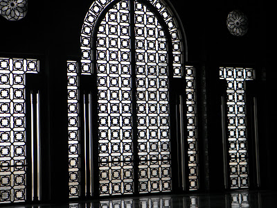 The atmosphere inside the mosque is surreal. The latticed windows and intricate lamps create very soft sunlight areas that contrast highly with deep shadows.